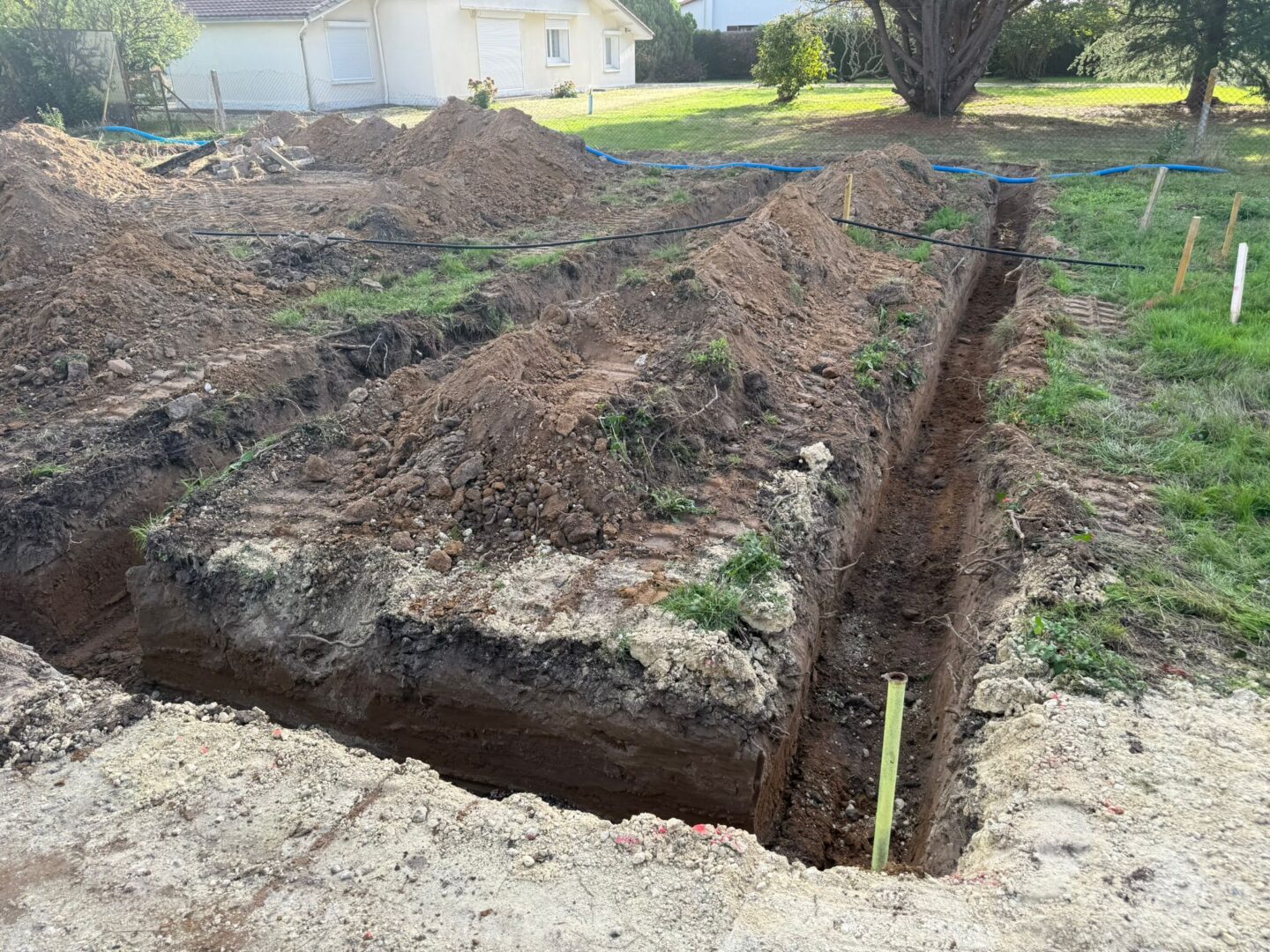 Locabenne s’occupe pour vous de l’installation d’un système d’assainissement complet : installation d’une cuve de 3000L, épandage de cailloux et création de 4 drains de 15 mètres.